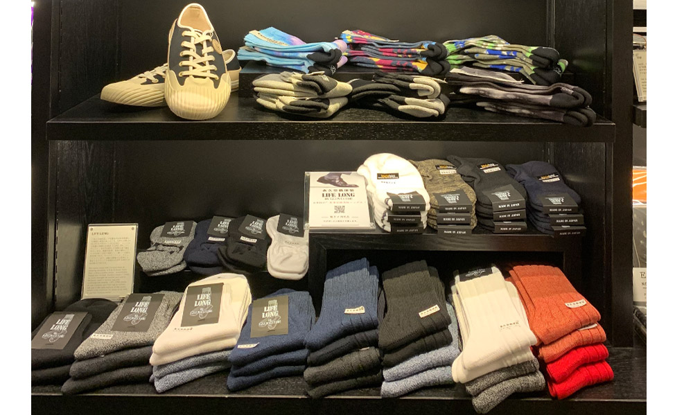 こちらのコーナーではサステナブルな雑貨や文具、アパレル雑貨まで展開されており、KHLからは、リサイクルキャンバススニーカーとリサイクルポリエステルソックスが展開されています。 SDGs関連の書籍なども幅広く扱っているので、ぜひ立ち寄ってみてください。
