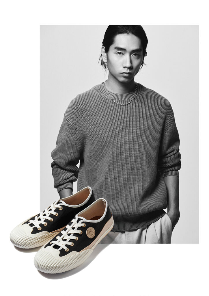 使用済みペットボトルや衣料品、繊維クズをリサイクルしたポリエルテル繊維『エ コペット ®』を靴のアッパーに採用したスニーカー。 ソール部分にはラバーテープを何層にも巻きつけたことでボリューム感のあるワ イドシルエットを形成しています。 アクセントとなるワッペンには、ブランドを代表するスローガンでもある「CHOOSE LIFE」 をあしらっています。